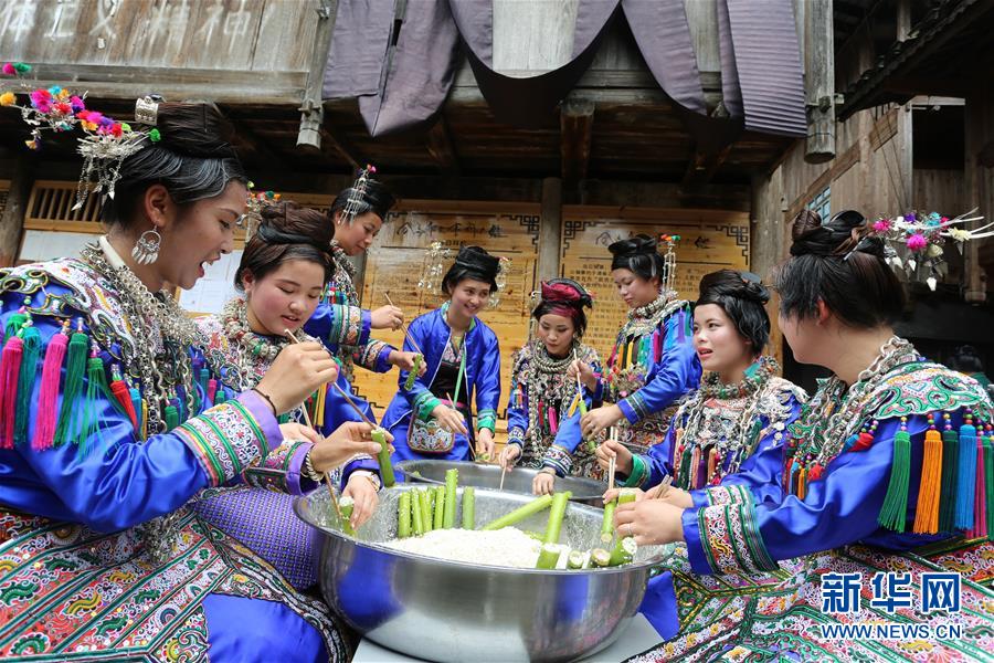 5月3日,贵州省榕江县乌公侗寨的侗族姑娘将糯米装入竹笋,准备蒸煮竹米饭。当天,贵州省首批魅力侗寨——榕江县乌公侗寨欢度传统的竹米节,重温侗民远古农耕风情。竹米节也叫吃竹笋饭,在每年谷雨至立夏期间竹笋生长的时候,侗族群众采摘斑竹笋,把糯米灌进笋筒煮熟食用。这样既能保持米饭的原味,又有竹笋的清香,并且还方便携带至坡上田间地头食用。久而久之,侗族人每到春夏之交的农耕时节都会过竹米节,杀猪宰羊祭祀侗族祖先,唱歌跳舞祈求五谷丰登。新华社发(杨成利 摄)