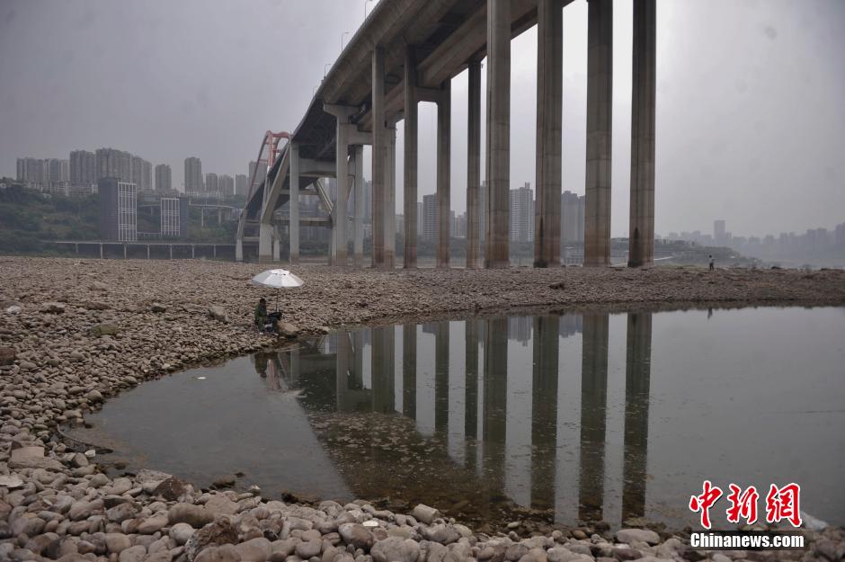 5月4日,长江重庆段水位持续走低,大面积河床已裸露在外。图为市民正在干枯的河床上垂钓。 陈超 摄
