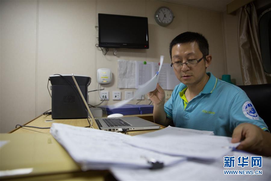 首席助理黄威在整理记录科研数据的班报(4月25日摄)。新华社记者金立旺摄
