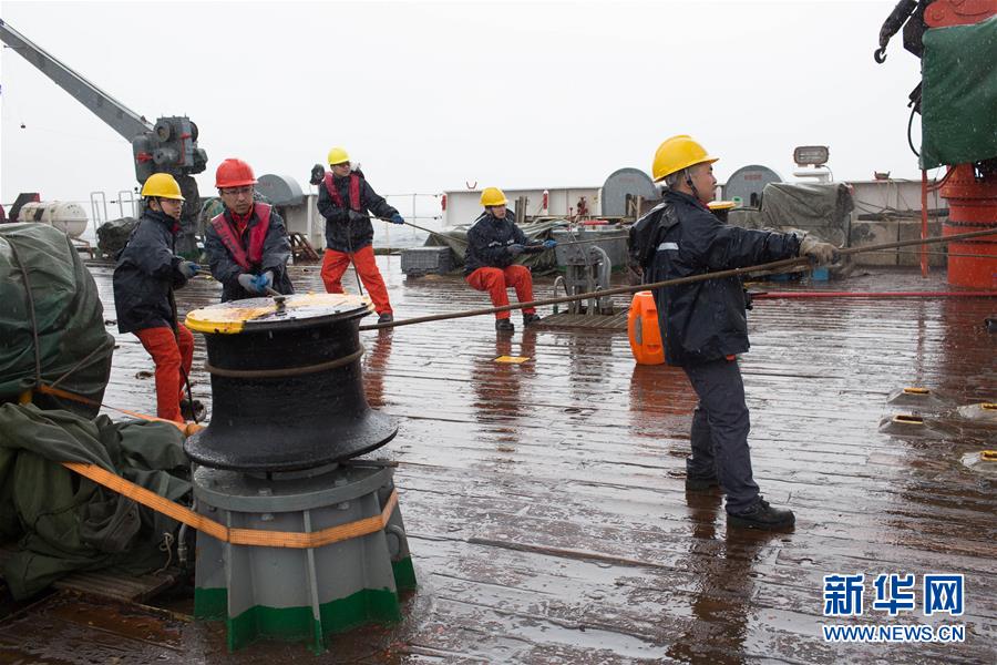 队员们在拉止荡绳,固定可视抓斗(5月1日摄)。当天海况很差,浪高4米左右,风力6-7级,本来计划的作业项目回收天然地震仪设备有风险,决定放弃回收海底地震仪,先开展可以控制的投放可视抓斗的任务。新华社记者金立旺摄