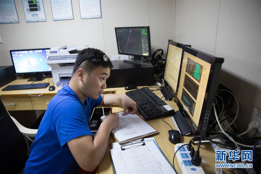 队员林鹏正在地球物理实验室值班,记录多波束数据(4月26日摄)。新华社记者金立旺摄