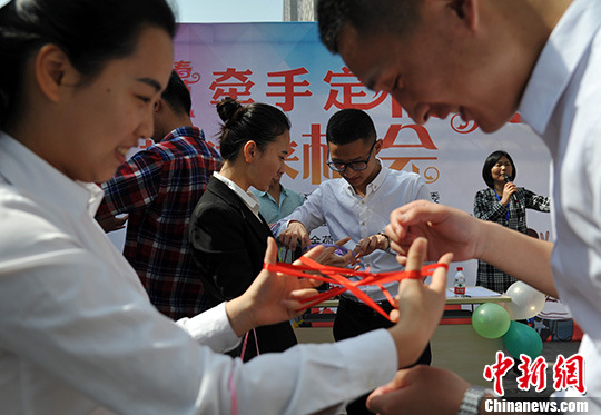 5月4日,五四青年节当天,安徽省合肥市金荷社区举行“牵手定情缘”相亲会活动,辖区适龄未婚青年通过参与游戏,互相交流,期待邂逅到属于自己的幸福。