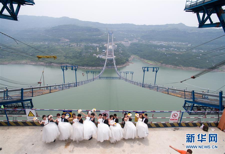 5月4日,8对新人在万州驸马长江大桥北岸的索塔顶端合影。当日,中交一公局“青春三峡,驸马爱情”主题婚纱派对在主跨长1050米的重庆万州驸马长江大桥上举行。8名来自一线岗位的小伙子和他们的爱侣身着婚纱礼服,走进摄影师的镜头,以特殊的方式迎接五四青年节的到来。这8对新人里既有技术负责人,也有普通工人;有的人孩子已经出生,有的正准备领结婚证,但他们的共同点就是由于工作繁忙,都还没拍婚纱照。于是施工方中交一公局万利万达总承包部一分部决定在“五四”期间为他们举行集体婚纱摄影派对,得到大家的热烈响应。重庆万州驸马长江大桥是重庆万州至湖北利川高速公路重要控制性工程,桥址位于万州下游6公里处。大桥全长2030米、主跨长1050米,是我国目前为数不多的单跨千米级钢箱梁悬索桥。新华社记者 刘潺 摄