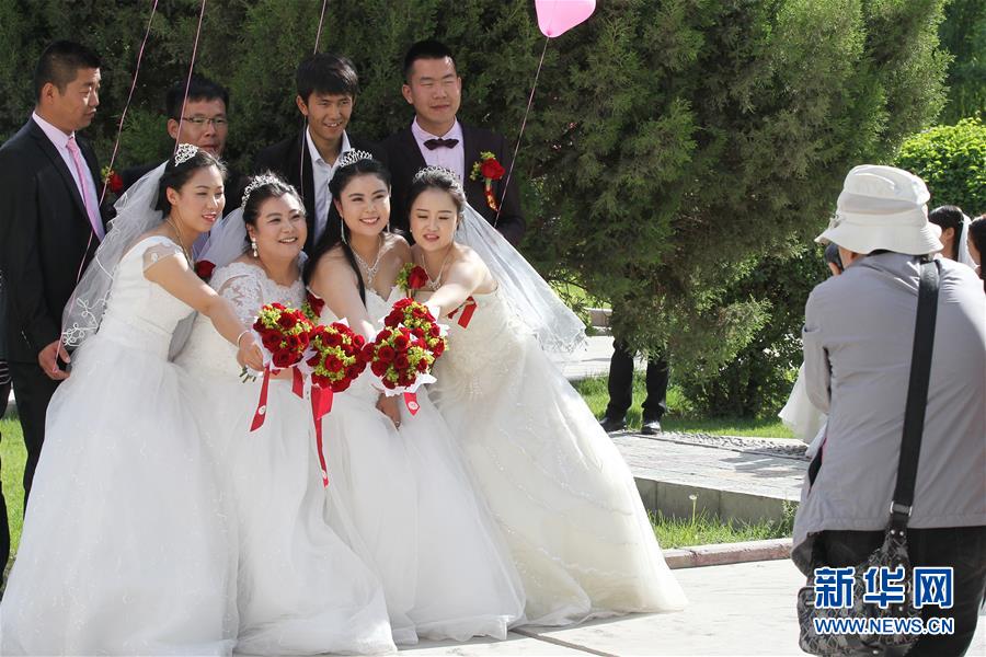 5月4日,在新疆哈密时代广场,新人们拍照留影。当日是“五四”青年节,新疆哈密市举办首届“情定伊州甜蜜哈密”大型集体婚礼,来自哈密市各乡镇的维吾尔族、哈萨克族、回族、汉族等民族的60对新人参加了集体婚礼,喜结良缘。 新华社发(普拉提摄)