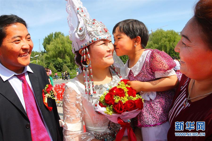 5月4日,在新疆哈密时代广场,一对新人接受亲人的祝福。当日是“五四”青年节,新疆哈密市举办首届“情定伊州甜蜜哈密”大型集体婚礼,来自哈密市各乡镇的维吾尔族、哈萨克族、回族、汉族等民族的60对新人参加了集体婚礼,喜结良缘。 新华社发(普拉提摄)
