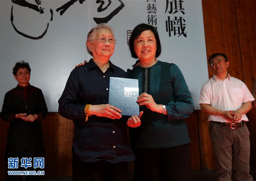 5月4日,贺友直遗孀谢慧剑(左一)在宁波美术馆接收捐赠证书。 新华社发(索向鲁 摄)