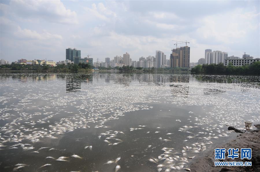 5月4日,海口市红城湖面漂浮着大量死鱼,发出腥臭味。