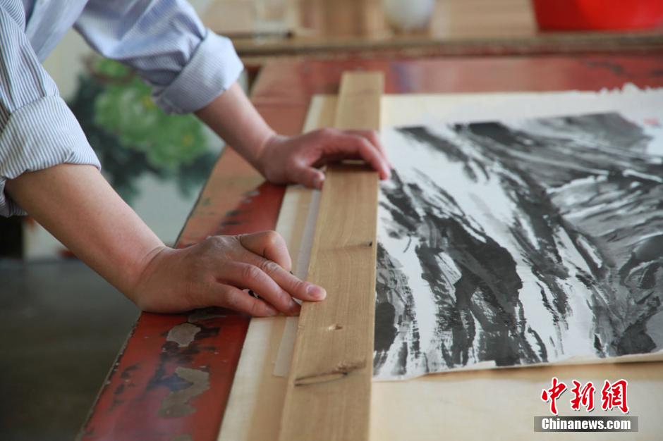 如今张文军招收了20多个学生学习传统书画装裱修复。他渴望书画装裱修复在西北地区能早日实现学院教育,让传统文化得到更好的传承,匠人得到社会的认可和尊重。图为裁剪书画。 刘玉桃 摄