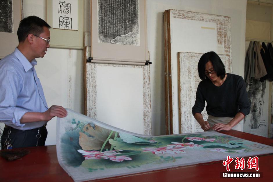 图为搭托,固定颜料,同时使画平展。 刘玉桃 摄