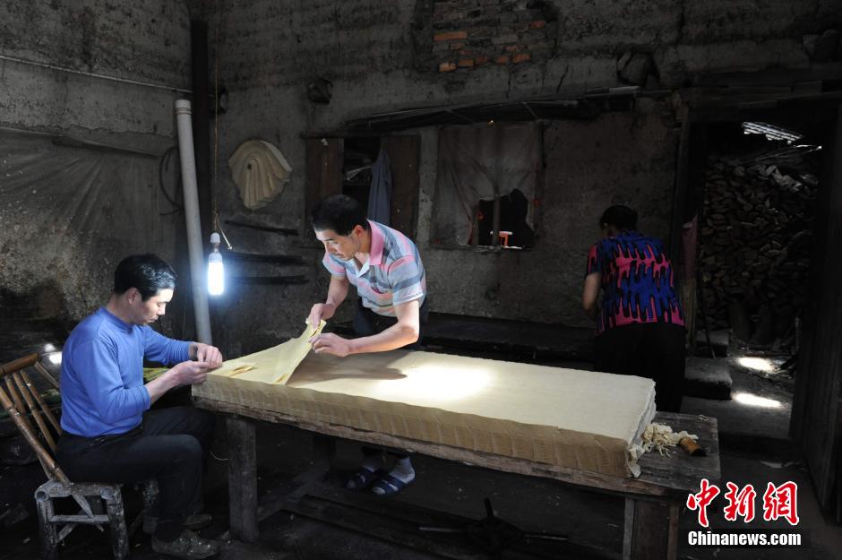 造纸术,中国四大发明之一。如今,在造纸术广泛应用的今天,福建省长汀县偏远的客家山村——铁长乡洋背村,仍保存着“既土又古”的造纸法,其所采用的原料、工具、工艺流程都几乎与1800年前的一般无二,被誉为造纸业的“活化石”。图为工人们正在将纸张分开。 袁鸿梅 摄