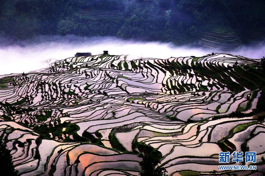 5月5日,贵州省加榜梯田晨雾弥漫美不胜收。时值立夏时节,位于贵州省从江县大山深处的加榜乡加榜梯田蓄水充盈,层层叠叠,田埂蜿蜒,构成一幅醉人的初夏画卷。 新华社发(刘朝富 摄)