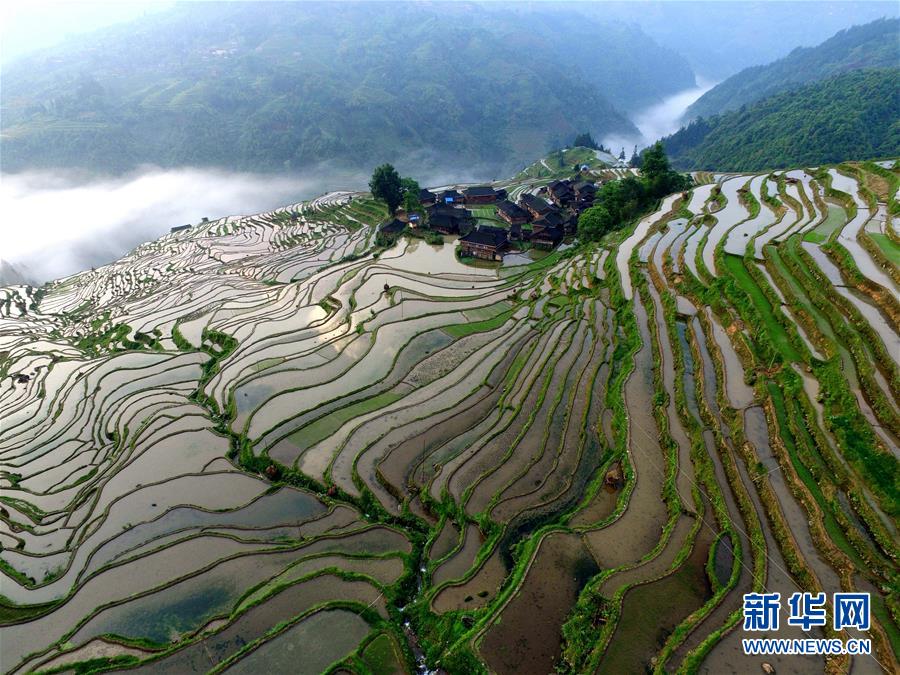 这是5月5日航拍的贵州省月亮山梯田美景。时值立夏时节,位于贵州省榕江、从江县交界处的月亮山百里梯田雨后初晴,云雾缭绕,景色如画。 新华社发(王炳真 摄)