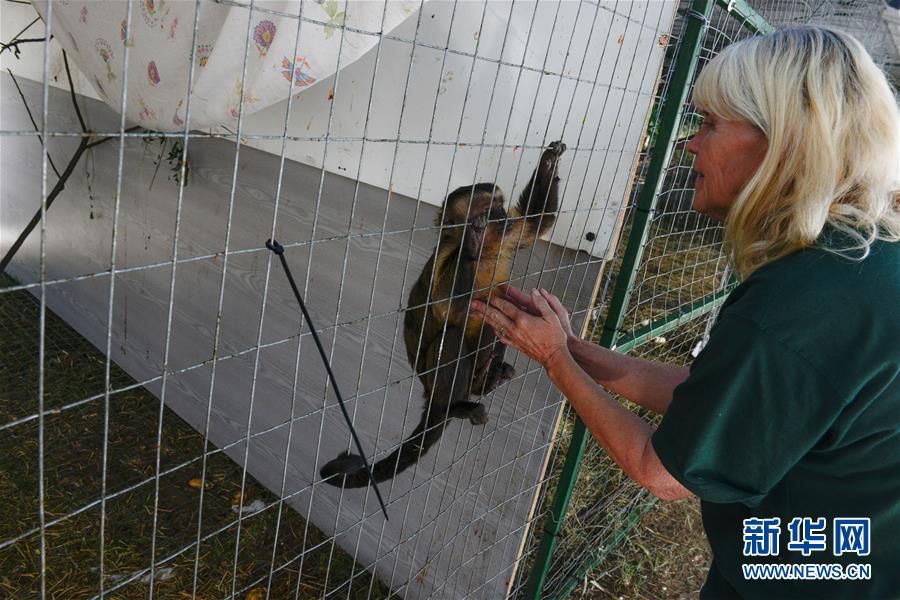 5月5日,在国际灵长类动物援救组织位于南非比勒陀利亚北部的基地,志愿者照顾一只被解救的僧帽猴。新华社记者翟健岚摄