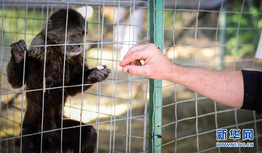 5月5日,在国际灵长类动物援救组织位于南非比勒陀利亚北部的基地,志愿者给一只被解救的僧帽猴喂食止痛药。新华社记者翟健岚摄