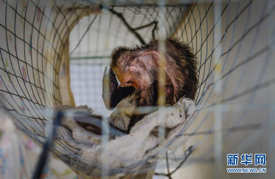 这是5月5日在国际灵长类动物援救组织位于南非比勒陀利亚北部的基地拍摄的一只此前遭受严重虐待的僧帽猴。 新华社记者翟健岚摄