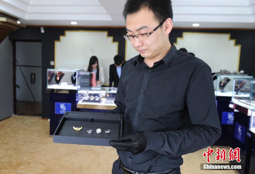 李根展示着由他们自己设计的带有校园元素的“毕业系列”珠宝。 张瑶 摄