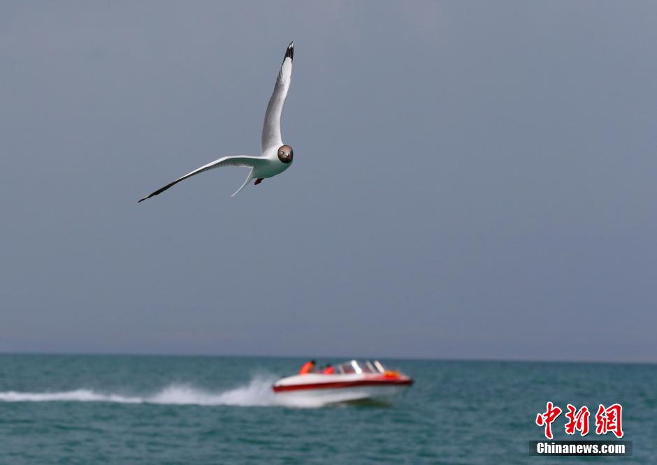5月7日,青海湖鸟岛迎来大量候鸟,拉开2016年观鸟季序幕。据青海湖景区管理局近期巡湖监测数据显示,青海湖目前共监测到水禽37种,数量超过41700只。其中,已进入繁殖期的普通鸬鹚有11840余只、渔鸥8800余只、斑头雁6590余只、赤麻鸭460余只。图为游客乘坐快艇徜徉青海湖。 罗云鹏 摄