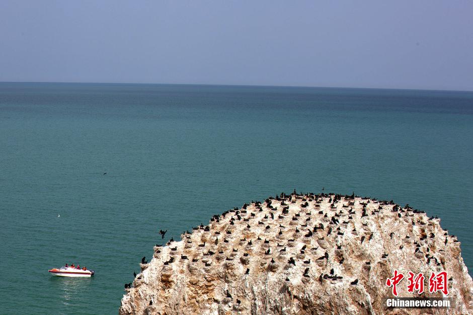 图为游客乘坐快艇至鸬鹚岛附近近距离观赏鸬鹚。 罗云鹏 摄