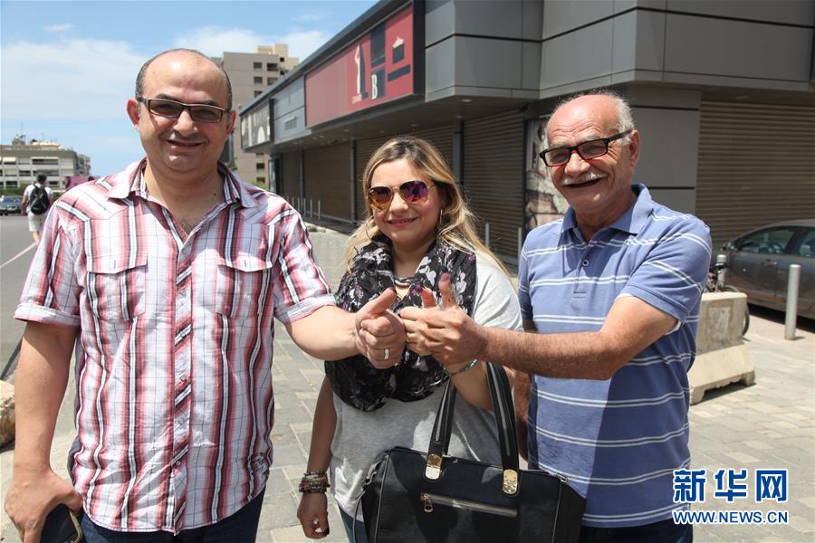 5月8日,在黎巴嫩首都贝鲁特一处投票站外,选民贝萨尔·卡乌尔(右)一家投完票后展示涂着墨水的手指。黎巴嫩8日开始举行地方选举,贝鲁特省等3个省份100多万选民当天率先进行投票,选举市政官员和村镇官员。 新华社记者李良勇摄