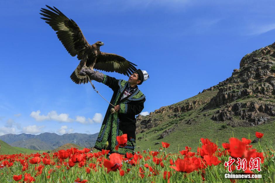 进入5月,位于新疆天山北麓的新源县天山红花进入盛开期,山坡上、路边的草地上成片开放,该花开时灿若云霞红似火,艳压群芳,形成红花的海洋,其美艳令人赞叹,吸引着众多游客欣赏漫山遍野的天山红花。图为当地牧民在红花丛中高举着鹰。 王玉军 摄
