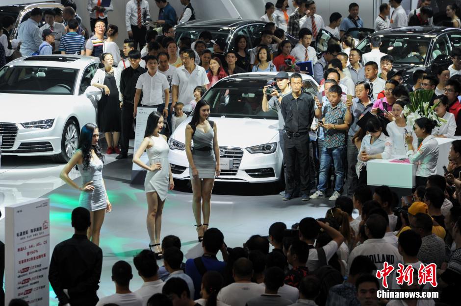 5月6日,三名模特在展台上亮相引围观。当日,第6届贵阳国际汽车展览会在贵阳国际会议中心举行,本届车展共吸引80余个汽车品牌、300余家全球汽车厂商参与。据车展组委会介绍,不少世界名车将在本届车展上首秀。 中新社记者 贺俊怡 摄