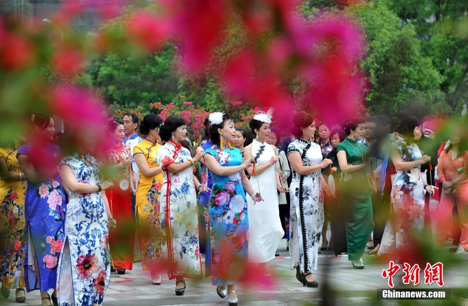 5月8日正值母亲节。武汉百名中年女性身着各式旗袍,在武汉沙湖公园街头上演了一场唯美的旗袍秀,秀出妈妈们的高颜值和长美腿,展示“绽放·旗袍人生”的中国旗袍文化。 中新社记者 张畅 摄