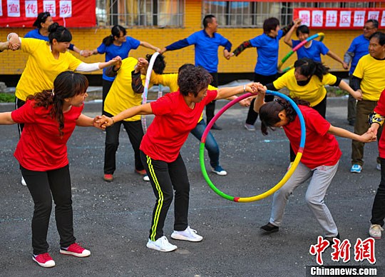图为邻居们手拉手完成“呼啦圈过山车”的游戏。中新社记者 刘新 摄