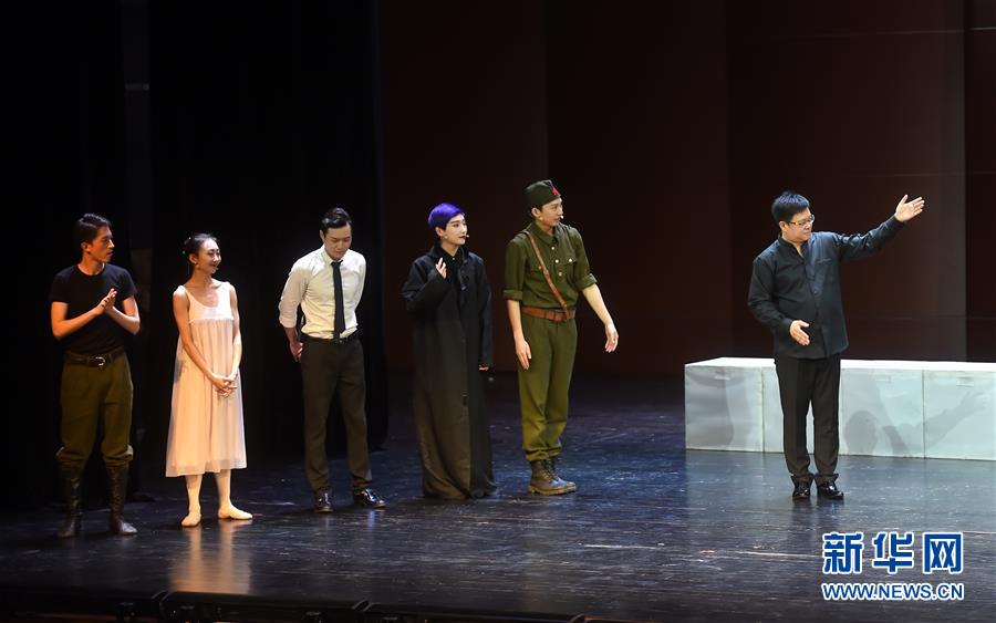 5月6日,指挥王晓柯(右一)在演出结束后与演员共同谢幕。当日,由中国国家交响乐团城堡室内乐团带来的中文版音乐戏剧《士兵的故事》在清华大学上演。该剧改编自俄罗斯作曲家斯特拉文斯基的同名舞剧,讲述士兵与恶魔斗争的故事。新华社记者金良快摄