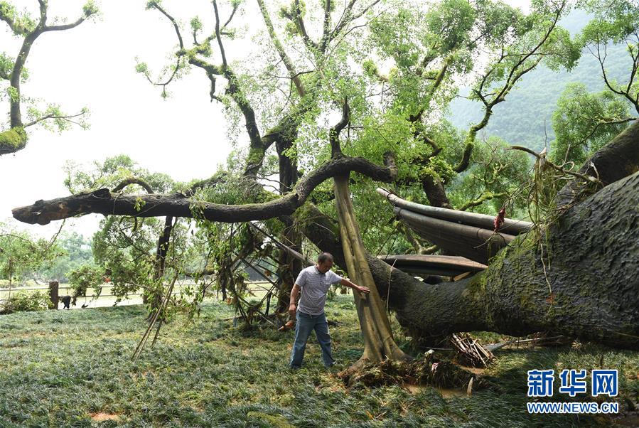 5月9日,景区工作人员在察看大榕树。受连日强降雨影响,广西桂林市阳朔县遭遇罕见洪灾。国家风景名胜区大榕树景区有着1426年历史的大榕树被洪水带来的杂物折断多根树枝。新华社记者 陆波岸 摄