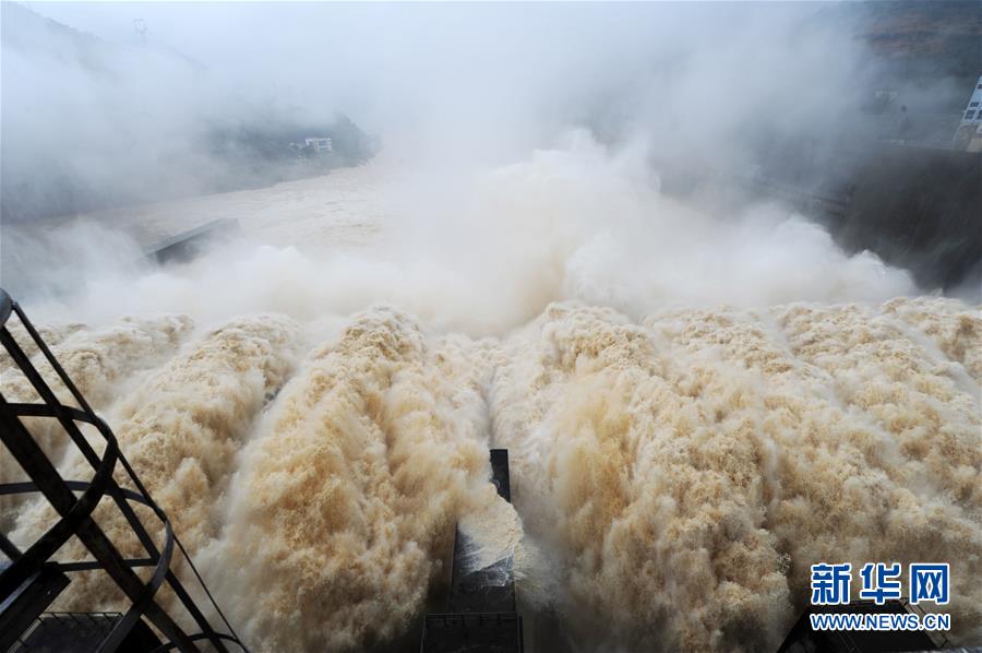 5月9日,福建闽江水口水电站大坝开闸泄洪。当日,福建闽江水口水电站出现今年以来最大洪水,入库洪峰流量高达20500立方米/秒。为缓解闽江上游闽西北三明、南平等地防汛压力,水口水电站已将溢洪闸门全部开启,并安排水情调度人员密切监视雨情动态,依据入库洪水实时预报结果迅速作出调度响应,保证水电站安全发供电和闽江上下游防洪防汛安全。新华社发(郑祖植 摄)