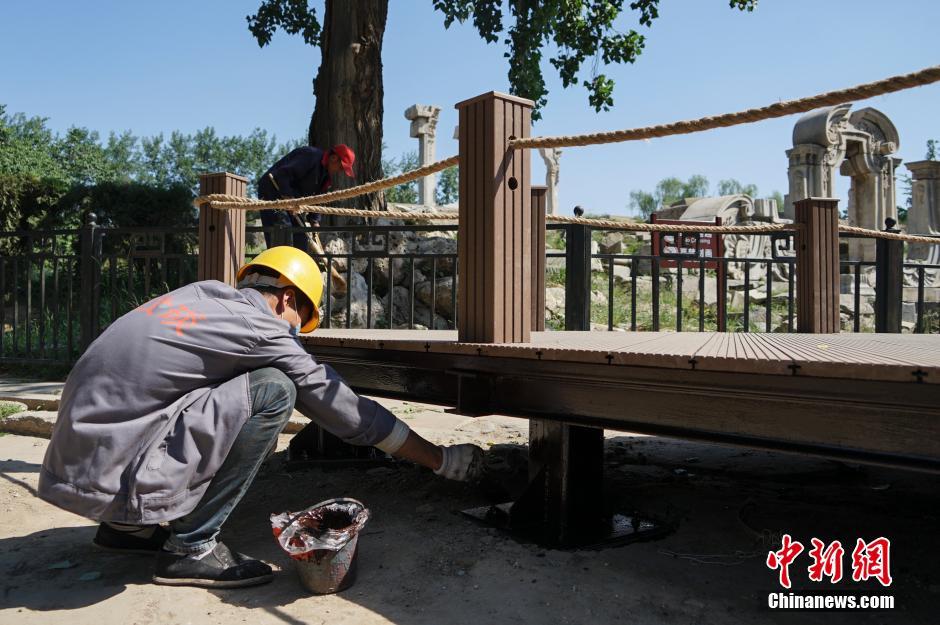 5月10日,工人在为木栈道上漆。圆明园在西洋楼遗址内铺设游览塑木栈道和设置防护栏,共涉及六片遗址区域,一定程度上实现了文物与游客的相对隔离。此次工程面积5769.8平方米,目前已完成木栈道铺设,预计五月中旬全部完工。