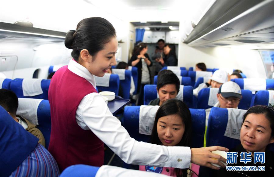 5月10日,一位空姐在模拟舱内为旅客服务。当日,南航黑龙江分公司举行了“阳光南航”公众开放日活动,通过南航微信平台选出40名幸运参与者走进黑龙江分公司的客舱模拟舱体验。据了解,该客舱模拟舱是全比例A320系列模拟舱段,具有声光电、多媒体监控系统等多种设备,能为使用者提供客舱真实感受。此次“阳光南航”公众开放日主办方为参与者设计了机上精品服务、空中急救和飞机迫降紧急撤离等环节,以增强参与者体验感受,丰富市民的航空知识。新华社记者王凯摄