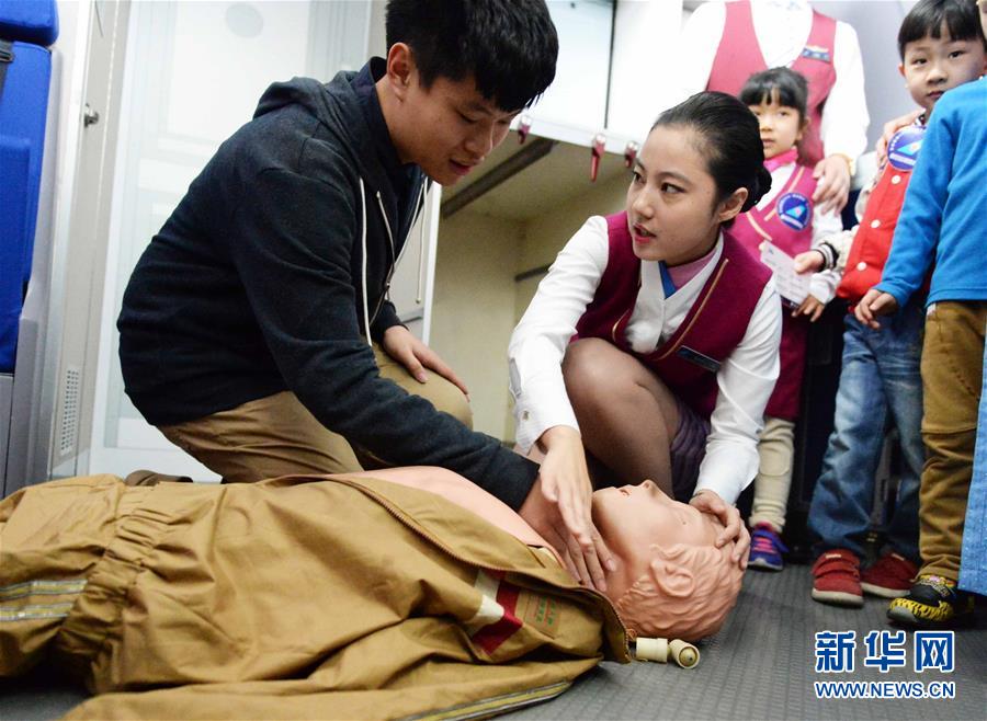 5月10日,一位空姐(左二)在模拟舱内教一名前来体验的旅客如何紧急施救。当日,南航黑龙江分公司举行了“阳光南航”公众开放日活动,通过南航微信平台选出40名幸运参与者走进黑龙江分公司的客舱模拟舱体验。据了解,该客舱模拟舱是全比例A320系列模拟舱段,具有声光电、多媒体监控系统等多种设备,能为使用者提供客舱真实感受。此次“阳光南航”公众开放日主办方为参与者设计了机上精品服务、空中急救和飞机迫降紧急撤离等环节,以增强参与者体验感受,丰富市民的航空知识。新华社记者王凯摄