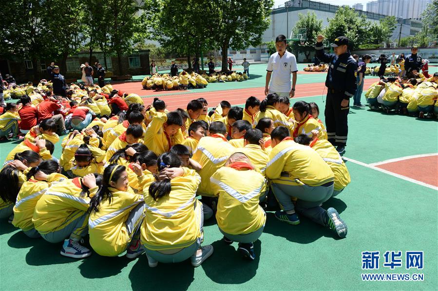 5月10日,甘荫塘小学学生在志愿者引导下进行紧急疏散演练。在第8个“全国防灾减灾日”前夕,贵州青年志愿应急救援服务总队的志愿者来到贵阳市南明区甘荫塘小学,向学生讲解防灾减灾自护自救知识,并举行模拟地震、火灾等灾害的紧急疏散演练。新华社记者 杨楹 摄
