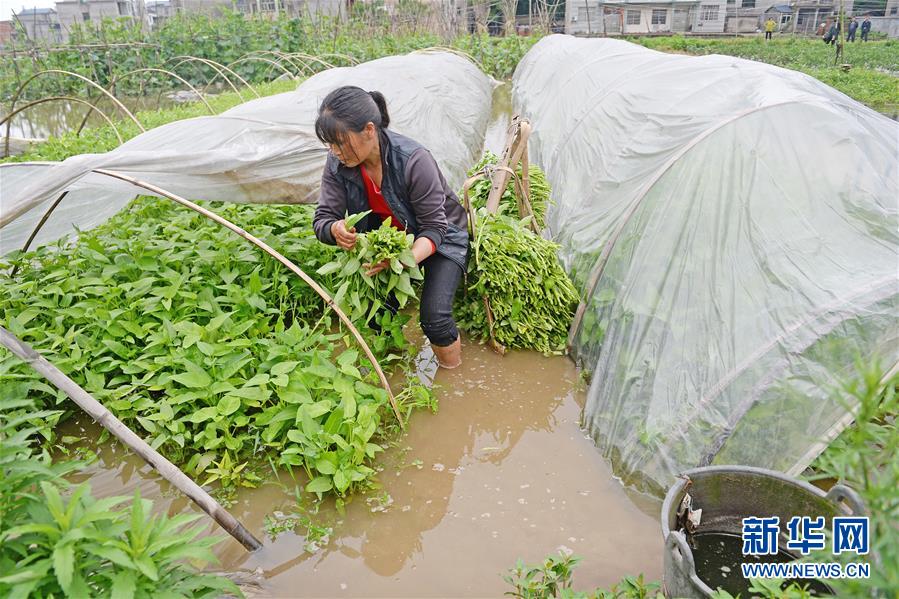 5月10日,村民在自家菜园抢收浸泡已久的空心菜。当日,记者在江西省上饶市铅山县河口镇虞家村采访看到,村民的200亩稻田和100亩蔬菜被近日的雨水浸没,经济损失严重。因排水沟堵塞,村民种植的水稻、蔬菜已在水中浸泡3日,积水最深处达1.5米,急需疏通排涝。连日来,江西多地持续出现强降雨过程,部分江河水位快速上涨,一些城乡低洼地带受淹,地质灾害多发频发,造成较大灾情。 新华社记者 万象摄