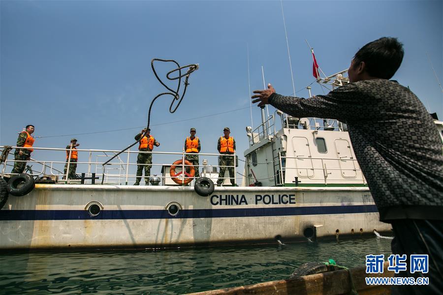 5月10日,大连边防官兵在演练中向渔船抛缆绳。