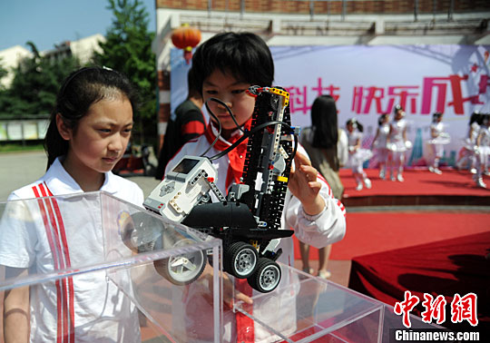 5月11日,安居苑小学学生展示楼梯攀爬机器人。中新社记者 韩苏原 摄