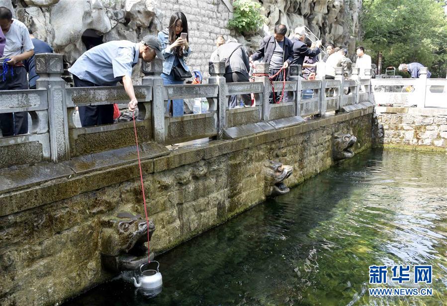 5月11日,市民在济南黑虎泉兽首处打水。一场降雨过后,济南“七十二名泉”之一的黑虎泉东侧兽首当日复喷。今年入春以来,受持续干旱影响,山东济南地下水位大幅下降,众多泉水出现停喷或喷涌无力现象。新华社记者朱峥摄