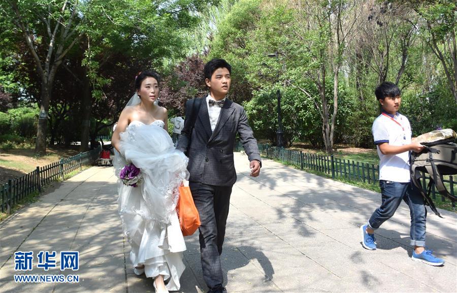 5月11日,在济南大明湖免费开放区,一对新人在摄影师的指挥下赶赴下一个拍摄点。