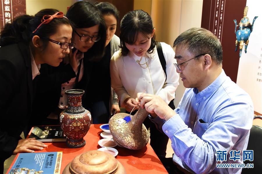 5月11日,景泰蓝制作技艺代表性传承人钟连盛(右一)向观众演示景泰蓝制作技艺。当日,“燕京八绝”能工巧匠展在北京太庙艺术馆开幕,展示了景泰蓝、玉雕、牙雕、雕漆、金漆镶嵌、花丝镶嵌、宫毯、京绣为代表的“燕京八绝”作品。新华社记者 李欣 摄