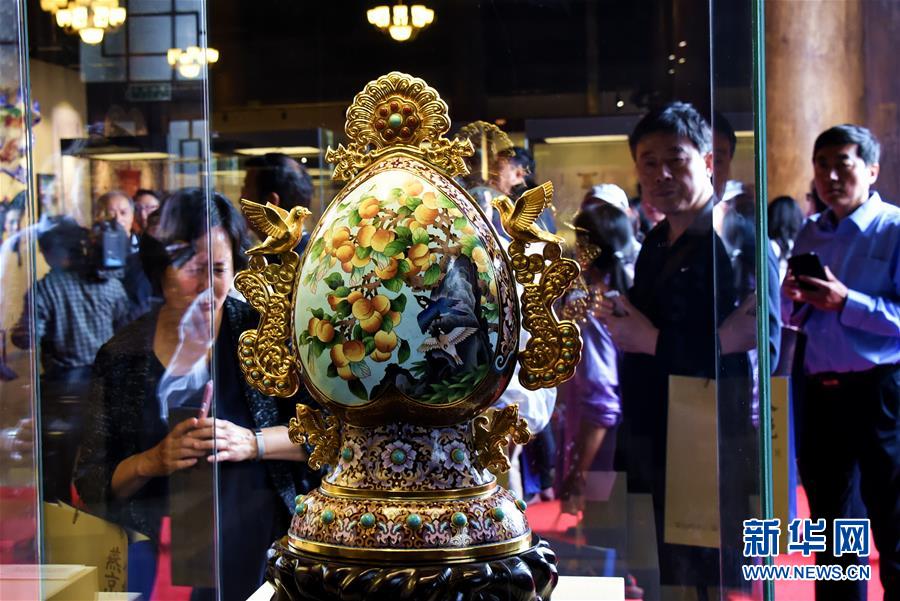 5月11日,观众在观看“燕京八绝”工艺品。当日,“燕京八绝”能工巧匠展在北京太庙艺术馆开幕,展示了景泰蓝、玉雕、牙雕、雕漆、金漆镶嵌、花丝镶嵌、宫毯、京绣为代表的“燕京八绝”作品。新华社记者 李欣 摄