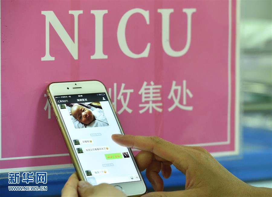 这是5月10日拍摄的李颖在今年母亲节收到的早产儿妈妈发来的照片和微信。 新华社发(曹阳 摄)