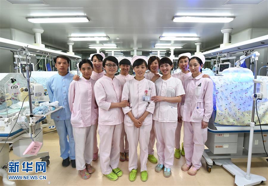 5月10日,山西省儿童医院新生儿重症监护室的护士们在交接班的间隙合影留念。 新华社发(曹阳 摄)