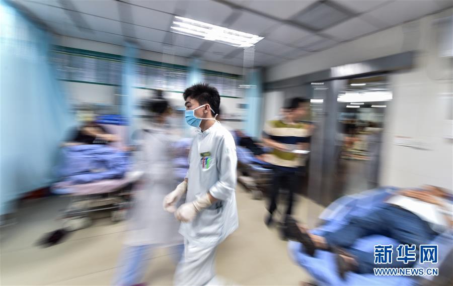 5月9日,深圳市人民医院急诊科护士谭杰在抢救室里忙碌。 2015年10月,深圳市人民医院成立了深圳历史上首个男护士工作组,该工作组目前有104名男护士,分布在急诊科、手术室、脑外科等科室。急诊科目前共有27名男护士,约占护士总数的五分之一。由于处于抢救危急病人和应对突发事件的第一线,急诊科几乎每个班次都有2名以上男护士当班,他们凭借敬业的态度得到了同事和患者的普遍认可。新华社记者 毛思倩 摄
