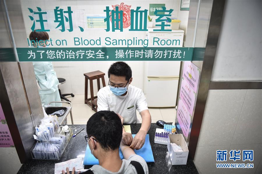 5月9日,深圳市人民医院急诊科护士刘贺龙在为患者抽血。 2015年10月,深圳市人民医院成立了深圳历史上首个男护士工作组,该工作组目前有104名男护士,分布在急诊科、手术室、脑外科等科室。急诊科目前共有27名男护士,约占护士总数的五分之一。由于处于抢救危急病人和应对突发事件的第一线,急诊科几乎每个班次都有2名以上男护士当班,他们凭借敬业的态度得到了同事和患者的普遍认可。新华社记者 毛思倩 摄