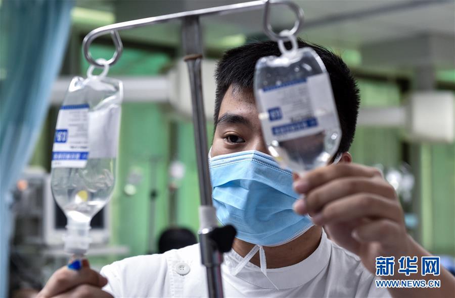 5月10日,深圳市人民医院急诊科护士孙奇峰在抢救室为病人换注射液。 2015年10月,深圳市人民医院成立了深圳历史上首个男护士工作组,该工作组目前有104名男护士,分布在急诊科、手术室、脑外科等科室。急诊科目前共有27名男护士,约占护士总数的五分之一。由于处于抢救危急病人和应对突发事件的第一线,急诊科几乎每个班次都有2名以上男护士当班,他们凭借敬业的态度得到了同事和患者的普遍认可。新华社记者 毛思倩 摄