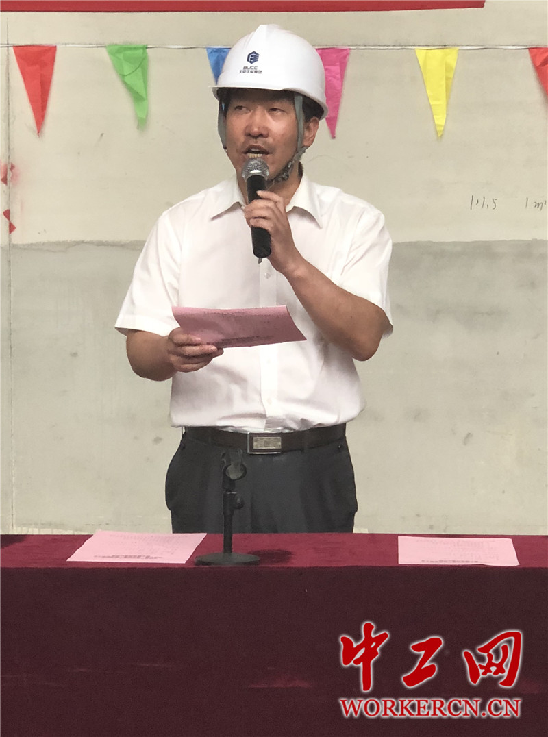 荣金锴为参与党员责任区暨“七大工程”先锋岗的全体人员加油鼓劲,宣布北京住总集团档案馆新馆项目“党建引领 综合攻坚”正式启动。