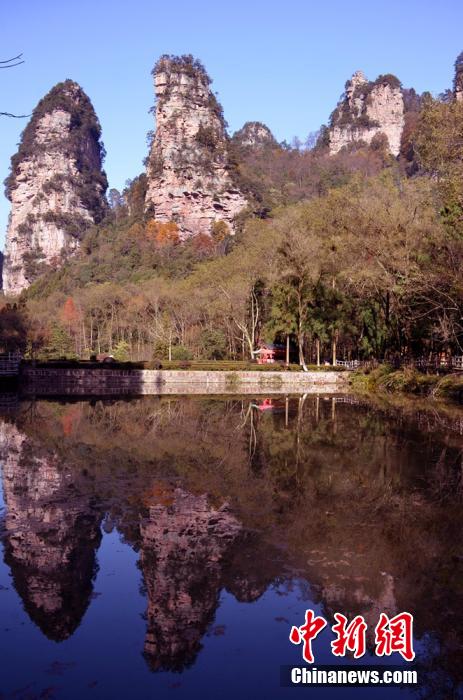 11月24日,经过细雨洗刷后张家界武陵源风景区秋色迷人。七彩的秋叶、蔚蓝的天空、绝美的峰林构成一幅秋意风光图,众多游人徜徉其间,赞不绝口。吴勇兵 摄