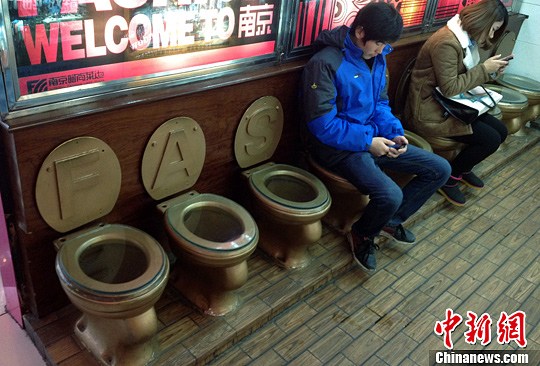 12月16日,南京一家商场卫生间门口,“马桶”造型的凳子一字排开,供市民休息。虽然座椅的造型有些夸张,却给前来购物的消费者带来轻松心情。中新社发 泱波 摄