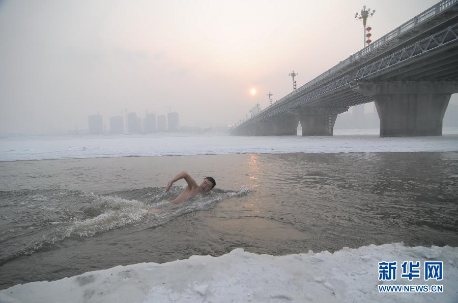 1月20日,一名冬泳爱好者在牡丹江市江滨公园游泳。当日是二十四节气中大寒,黑龙江省牡丹江市迎来小雪天气,当地健身爱好者不畏严寒、坚持锻炼,感受体育运动带来的快乐。 新华社发(张春祥摄)